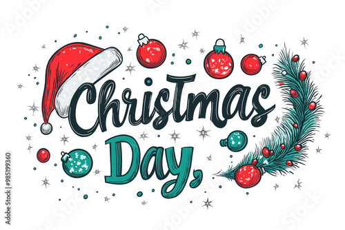 Logo in an elegant style with the text "Christmas Day," vector art style lettering, hand-written cursive font, red, green, and white color palette, solid white background, vector graphics.