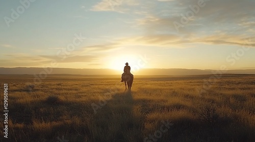 Lone cowboy silhouetted against a vibrant sunset riding across a vast, golden field.