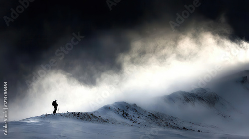 lone explorer stands on snowy ridge, observing dramatic avalanche under stormy sky, evoking sense of awe and isolation