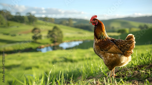 Lone hen foraging in a picturesque rural setting, with rolling hills and a serene pond in the distance, offering plenty of space for text overlay