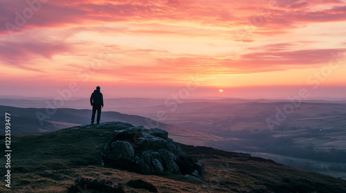Lone hiker on mountain peak at sunrise with vibrant sky and peaceful valley