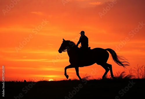 Lone rider silhouetted against vibrant sunset, horse galloping, shadow, adventure