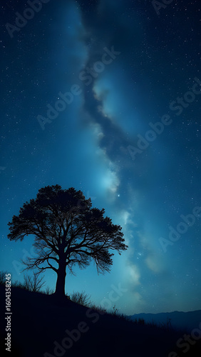 Lone Tree Under Starry Night Sky with Milky Way Glow