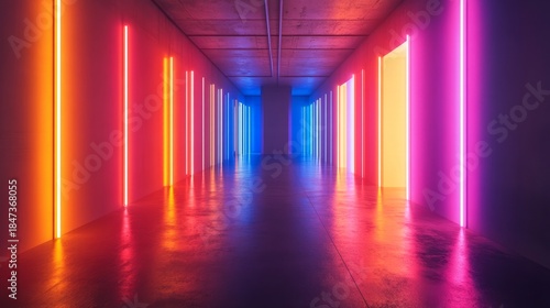 Long corridor illuminated by colorful neon lights in a modern architectural setting