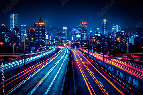 Long Exposure Photo of a Highway at Night with Vibrant City Lights and Skyscrapers, Long Exposure Photo of a Busy Urban Highway with Motion Blur During Evening Rush Hou