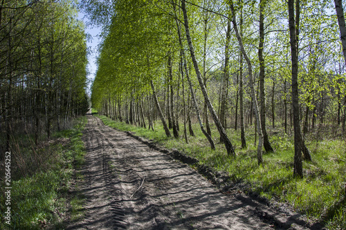 Long green avenue between birch trees