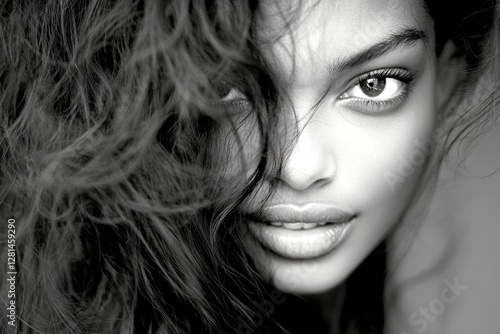 Long hairdo - beach waves hair. Pretty smiling mixed-race girl - for ads, media and social media use. Commercial ad pattern art. Vibrant hair style art. African american artistic.