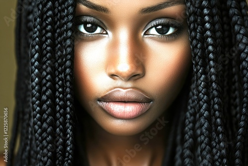 Long trim - braids hair. Commercial marketing visual idea layout. Gorgeous calm black girl - for ads, brochure and social platforms use. Black elegance. Fashion with black elegance.