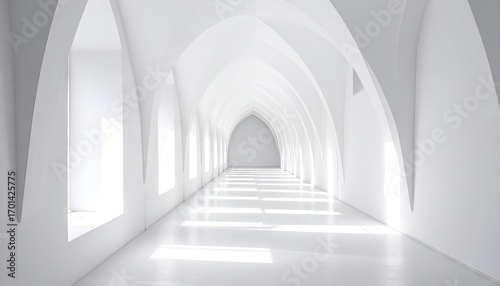 Long White Corridor With Vaulted Ceilings And Sunlight Streaming Through Windows
