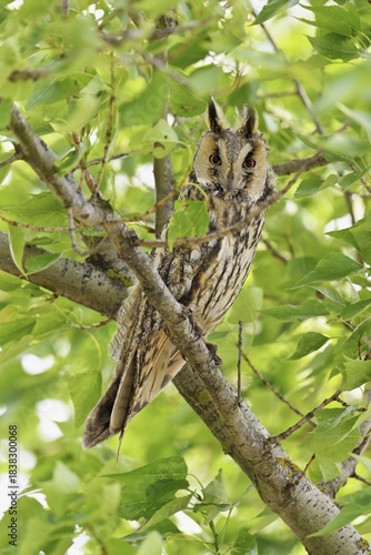 Long-eared owl (Asio otus), sitting in a tree, Lake Neusiedl, Burgenland, Austria
