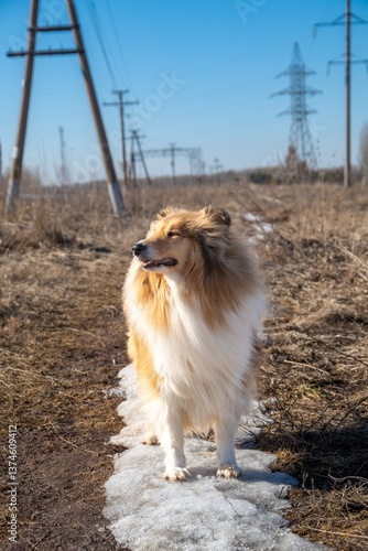 Long-Haired Collie on a Snowy Path in an Open Field