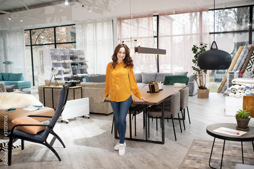 Long-haired pretty woman standing near the table