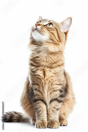 Long-haired tabby cat looking upward, isolated.