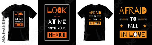 Look at me with your heart. Afraid to fall in love. Modern typography t-shirt design for prints, apparel, vector, art, illustration, typography, poster, template, and trendy black tee shirt design.