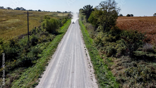 Looking down a gravel road with dust being blown by a vehicle. Path lined by power lines and trees