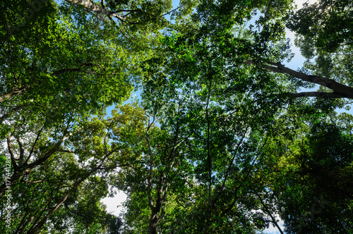 Looking up through tall green trees toward the sky in a tropical forest, sunlight filtering through the dense canopy.