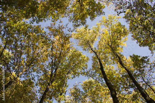 Looking up to tree tops in autumn