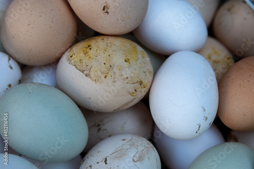 Lots of dirty chicken eggs. Healthy food and vitamins. Close-up.