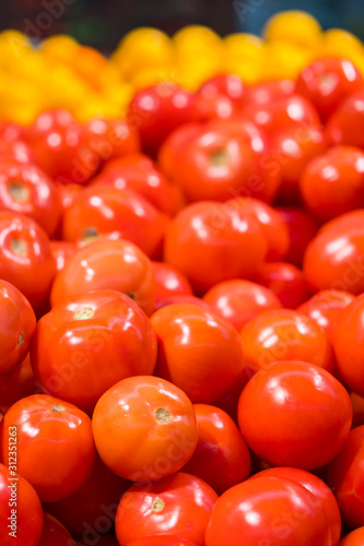 lots of tomatoes in the store. Showcase with tomatoes in a supermarket. A lot of red tomato. The choice of products. vegetables. vertical photo