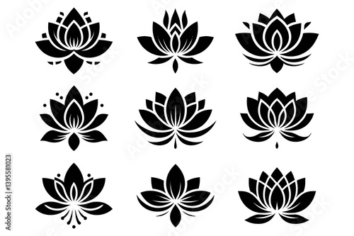 lotus flower silhouette logo set | minimal lotus flower logo set – black silhouette icons for meditation and wellness | minimalist vector icons for yoga and spa