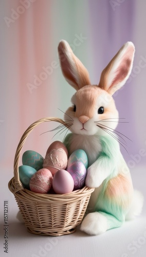Lovely easter bunny and basket of Easter eggs, cute baby rabbit against soft pastel background. Copy space for text. Symbol of easter festival animal