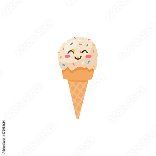Lovely kawaii face ice cream flat vector illustration isolated on white.