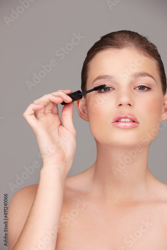 Lovely lashes. Studio portrait of a beautiful woman applying mascara.