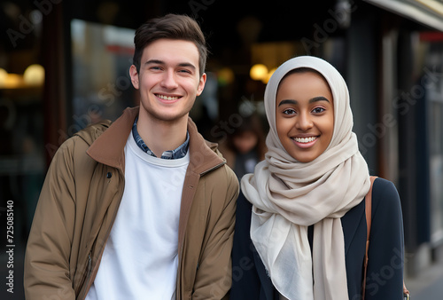 Lovely Muslim couple walking in a street and talking