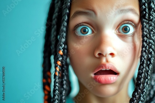 Lovely very astonished mixed-race girl - for ads, magazine ad and social apps use. Commercial marketing concept art. Long trim - braids hair. Black beauty advertising. African model style.