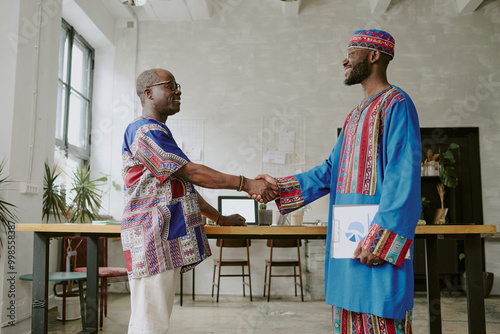 Low angle shot of African American coworkers in traditional costumes giving handshake to each other