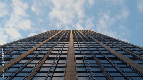 Low angle view of a modern skyscraper reaching towards a partly cloudy sky.