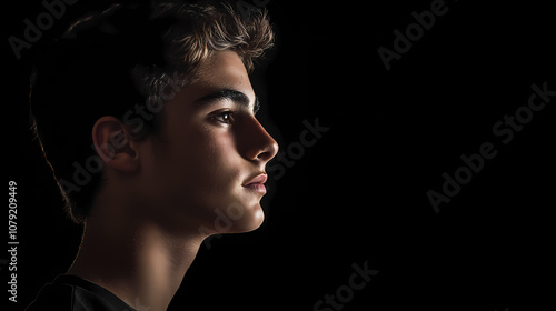 Low key portrait of a young man against a black background, dark relaxed profile shot with black copy spac. Chiaroscuro. Illustration