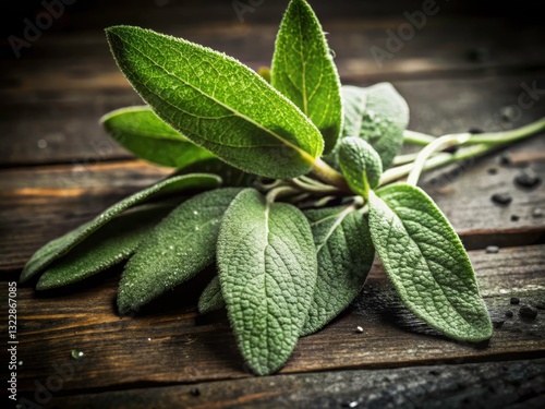 Low Light Sage Photography: Aromatic Herbs on Rustic Wood, Dark Moody Still Life