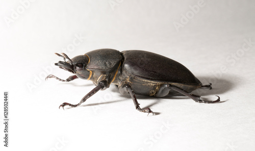 Lucanus cervus is the best-known species of stag beetle (family Lucanidae) in Western Europe. Imago, a female insect on, a white background.