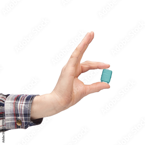 luggage and hand luggage, a miniature mint-colored suitcase on a white isolated background in the hand, the concept of a limit on the weight of baggage carried in airlines