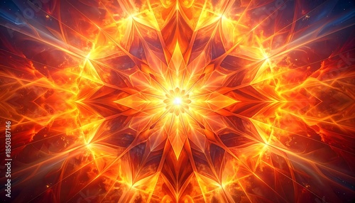Luminous, complex symmetrical starburst exploding in fiery colors against a celestial backdrop of blues and reds