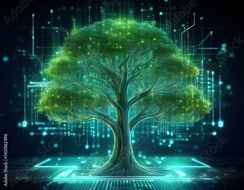 Luminous Green Tree with Digital Data Screens