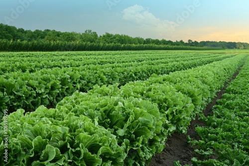 Luscious Green Lettuce Field at Sunrise, Serene Rural Agriculture Landscape with Verdant Crops and Leafy Trees