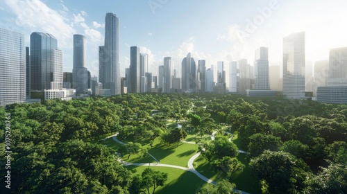 Lush City Oasis: Aerial 3D Render of Vibrant Park Amid Skyscrapers | Urban Green Spaces Concept Art