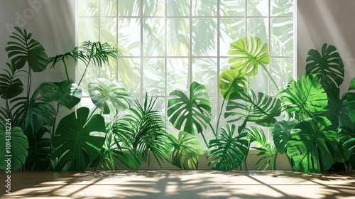 Lush cut-out of tropical plants, monstera, palm, rubber plant, and fern, in front of clear windows, natural light streaming in