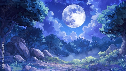 Lush forest at night under a full moon