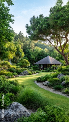 Lush garden path leading to a small pavilion