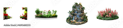 Lush Garden Waterfall and Floral Arrangements on Transparent Background, cut out
