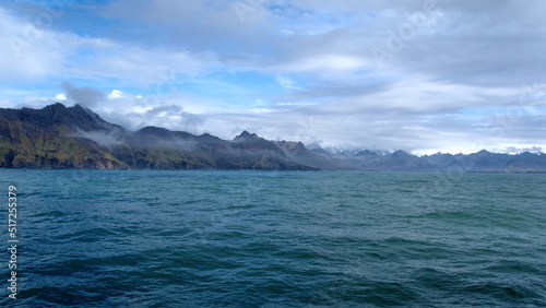 Lush green coastline on the Atlantic Ocean, below rugged mountains, at Leith Harbor, South Georgia Island