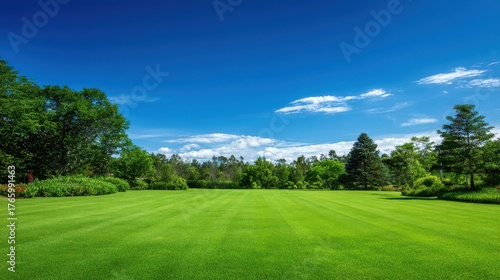Lush green field under a clear blue sky with scattered clouds and trees