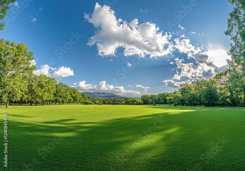 Lush Green Field Under Blue Sky with Clouds and Distant Hills