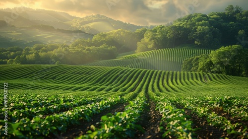 Lush green fields with crop rows under a golden sunrise in a tranquil agricultural landscape
