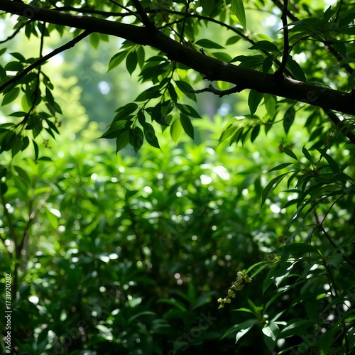 Lush green forest canopy with dappled sunlight filtering through leaves