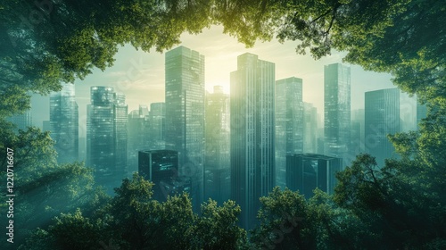 Lush Green Forest Framing a Modern City Skyline at Dawn, Illuminated by Soft Sunlight, Illustrating the Harmony Between Nature and Urban Development