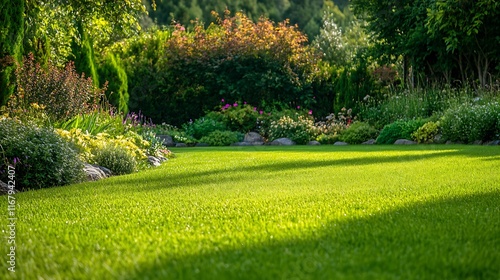 Lush Green Garden Paradise: A Serene Landscape of Vibrant Flora and Well-Maintained Lawn